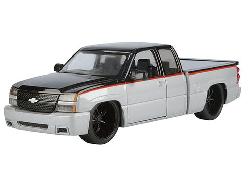 - Brand new 1/25 scale diecast model of a 2006 Chevrolet Silverado Custom Pickup Truck Silver Metallic and Black with Red Stripes "Die-Cast Collection" Series diecast model by Motormax.